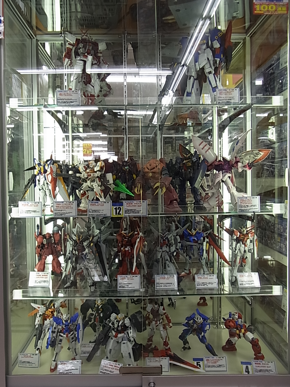 ショーケースに大量にガンプラを展示しております