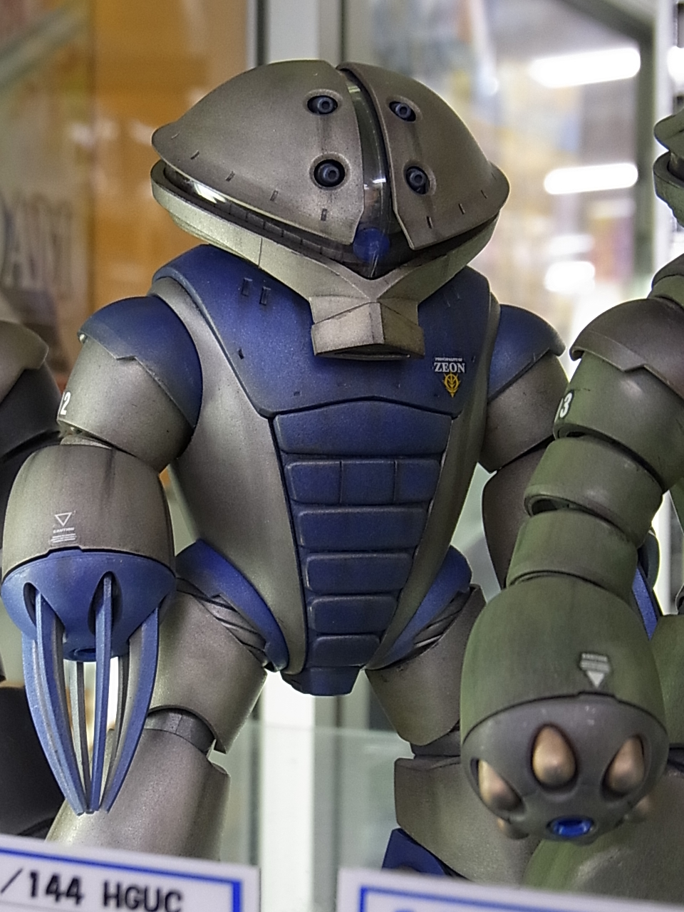 ひぃ、この調子で解説ですか('Д')誰も見てないかもなのにwえと、この2号機はつや消し下地でライトガンメタと青やけの2色ですねぇ。写真だとわからないですが左手もツメなので近接戦闘用として仕上げたので派手な色にしようと思ったんですが、あまり派手じゃないですね(汗)青やけの部分のみガンメタでエッジして後はススで汚した感じですねぇ。普通にライトガンメタ塗るともう少しシルバーなんですが、これは3回位つや消しとウェマ重ねたのかな、重量感出そうと思って少し明度下げてあります。モノアイもメタブルーなんですが角度によってはあまり目立ちませんね・・